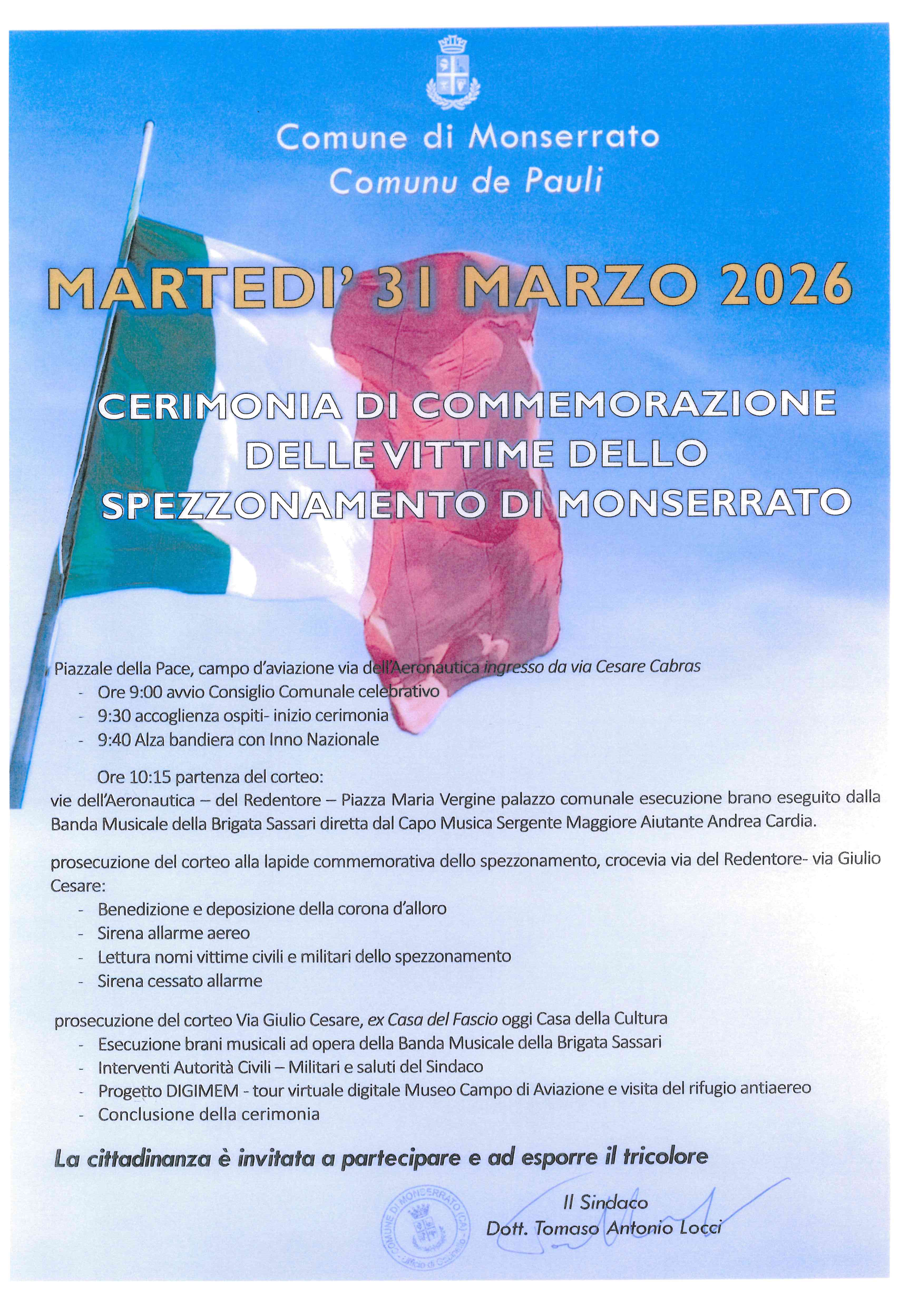 Ore 10:15 partenza del corteo: vie dell’Aeronautica – del Redentore – Piazza Maria Vergine palazzo comunale esecuzione Inno Nazionale eseguito dalla Banda Musicale della Brigata Sassari diretta dal Capo Musica Sergente Maggiore Aiutante Andrea Cardia prosecuzione corteo alla lapide celebrativa dello spezzonamento, crocevia via del  Redentore - via Giulio Cesare:
