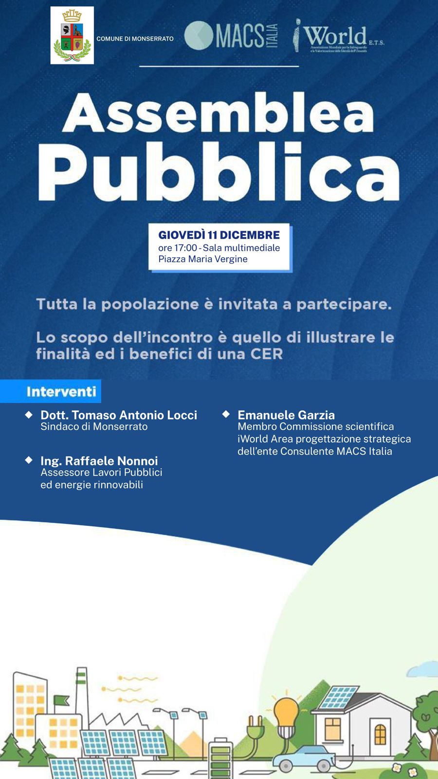 Tutta la popolazione è invitata a partecipare all'Assemblea Pubblica per Giovedì 11 dicembre ore 17:00 presso la sala multimediale in Piazza Maria Vergine (Monserrato).