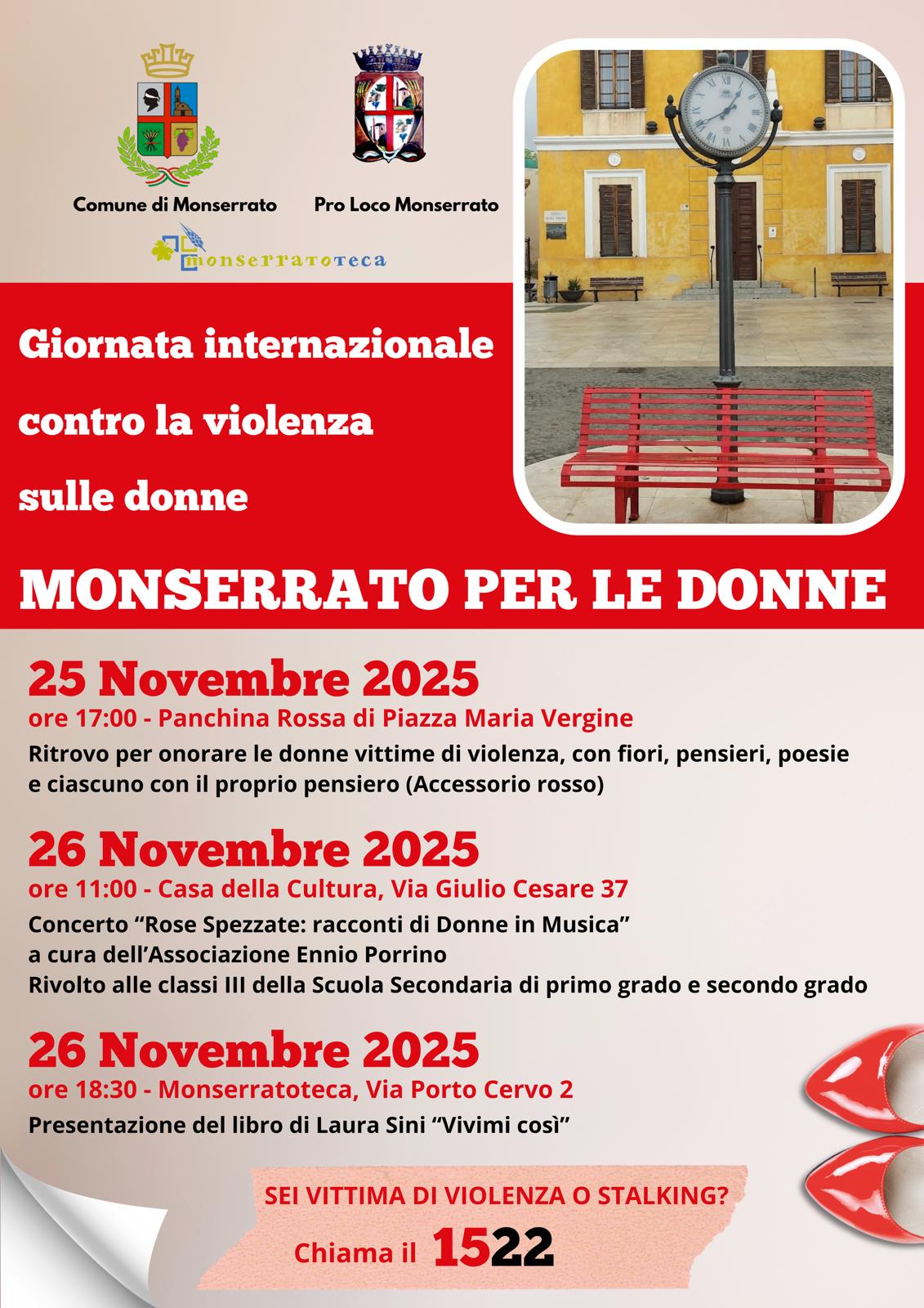 - 25 novembre 2025 ore 17:00 Panchina Rossa di Piazza Maria Vergine - Ritrovo per onorare le donne vittime di violenza, con fiori, pensieri, poesie e ciuscuno con il proprio pensiero (accessorio rosso);